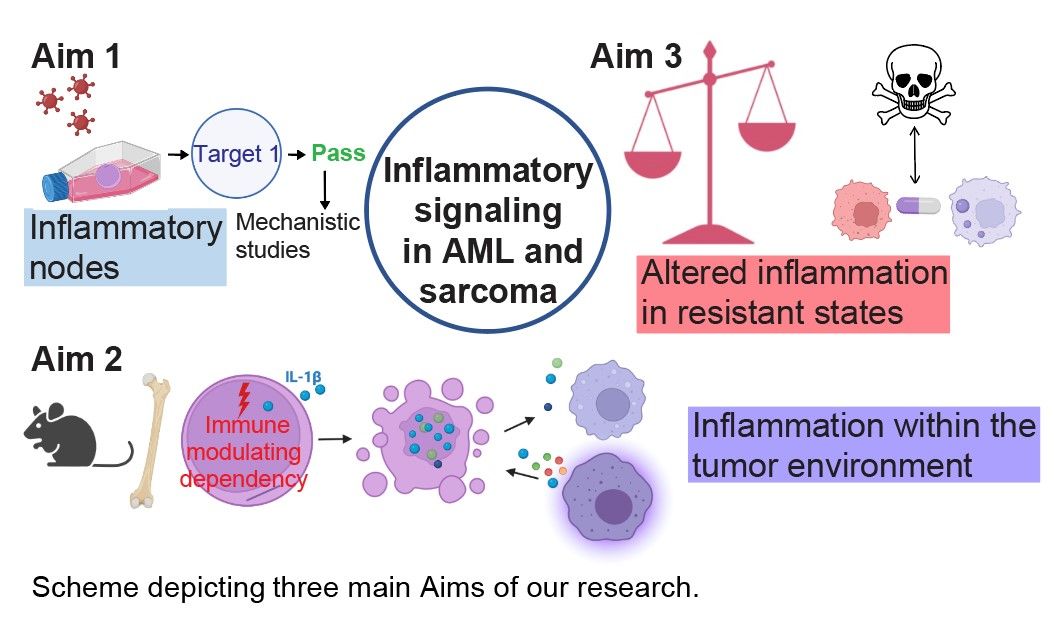 We aspire to exploit inflammatory signaling to discover mechanistically informed novel treatment strategies that improve the treatments and outcomes for patients with acute myeloid leukemia and sarcoma.