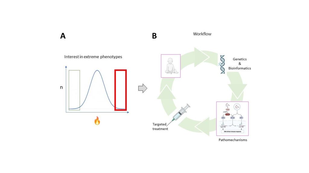 To understand disease mechanisms, especially extreme phenotypes of immune dysregulation and inflammation triggered by viral infections (A), we use a combined approach (B) integrating omics analyses (genomics and transcriptomics) to identify novel mutations, functional immunological assays and high-throughput microscopy to analyze immune responses, and disease models (patient-derived cells and animal models) to study interconnected pathways; these insights ultimately enable us to identify and validate drug targets for improved treatments. Partially created with Biorender.