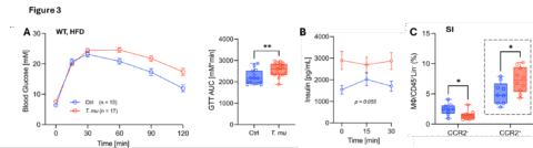 Die T. mu-Kolonisierung bei Wildtyp-Mäusen, die mit einer fettreichen Ernährung gefüttert wurden, führt zu einer gestörten Blutzuckerkontrolle, erhöhter Insulinsekretion und Darmentzündungen. (A) Intraperitonealer Glukosetoleranztest (ipGTT), Fläche unter der Kurve (AUC) von mit T. mu-Kolobisierung (rot) und nicht kolonisierten (blau) Mäusen. (B) Zirkulierendes Insulin, gemessen während der ersten 30 Minuten des ipGTT. (C) Entzündliche CCR2+-Makrophagen im distalen Dünndarmgewebe.