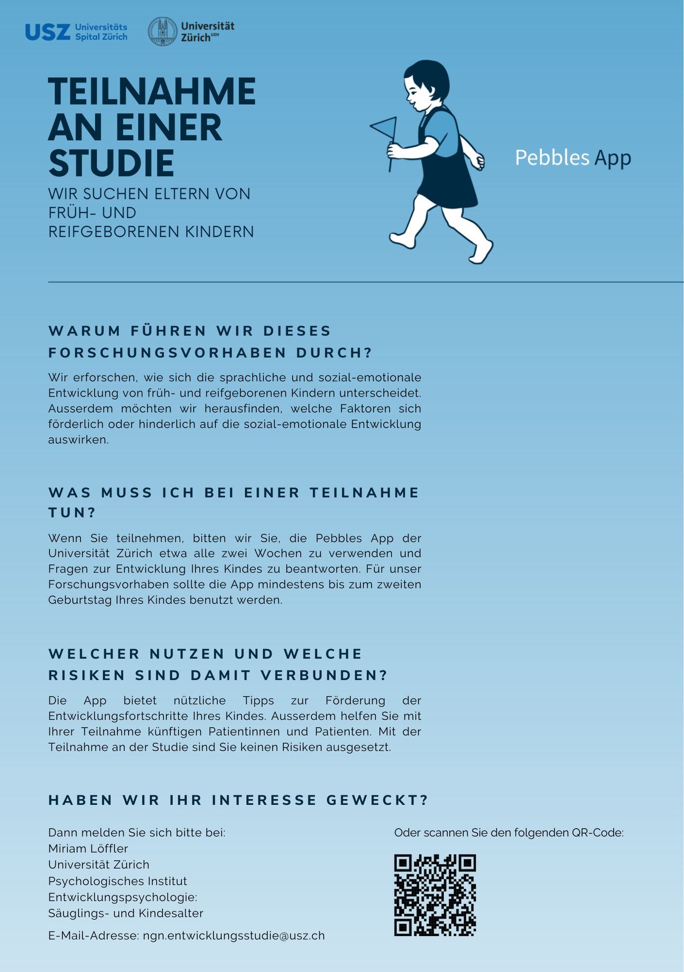 Die Studie untersucht, wie eine Frühgeburt die sozial-emotionale und sprachliche Entwicklung von Kindern beeinflusst. Ein besonderer Fokus liegt dabei auf Faktoren, die mit dem Temperament von Früh- und Reifgeborenen zusammenhängen. Mit der Pebbles App können Sie die Entwicklung Ihres Kindes in Form eines Tagebuchs dokumentieren und erhalten wertvolle Einblicke in wichtige Entwicklungsschritte Ihres Kindes. Wenn Sie teilnehmen möchten, kontaktieren Sie uns unter ngn.entwicklungsstudie@usz.ch.
