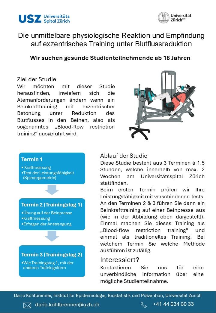 Wir möchten mit dieser Studie herausfinden, inwiefern sich die Atemanforderungen ändern wenn ein Beinkrafttraining mit exzentrischer Betonung unter Reduktion des Blutflusses in den Beinen, also als sogenanntes „Blood-flow restriction training“ ausgeführt wird.